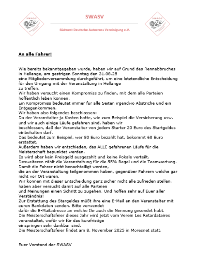 Dazu teile uns einfach die Klasse in der du starten möchtest, die gewünschte Startnummer, wenn schon vorhanden die Transpondernummer ,den Namen, das Fahrzeug sowie deinen Verein mit.