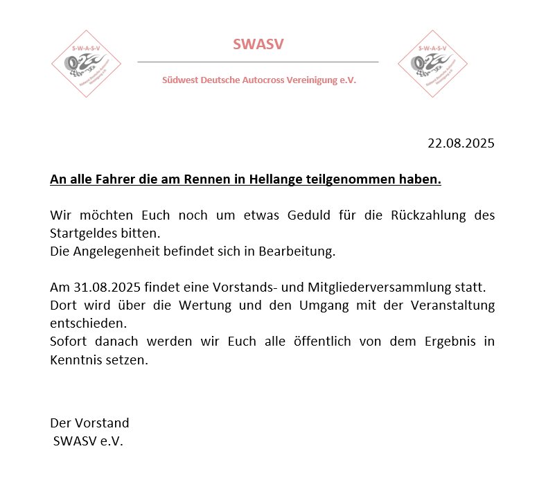 Das Rennen in Stephanshausen muss leider abgesagt werden, da Stephanshausen dieses Jahr leider keine Rennstrecke zur Verfügung steht.